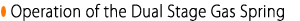 | The major feature of the Dual Stage Gas Spring (also known as the Inter Stop Gas Spring) is that the stroke can be separated at a specific part. At the first part, opening and closing is the same with other gas springs, it stops at a specific holding point, and then stops at an opening position at the second stroke by a manual stop. Compared with other gas springs, due to design changes, the Dual Stage Gas Spring always opens at a specific holding point, and then the door automatically opens to the end position when the stroke passes the standing point. Closing of the door is the same as other gas springs. |